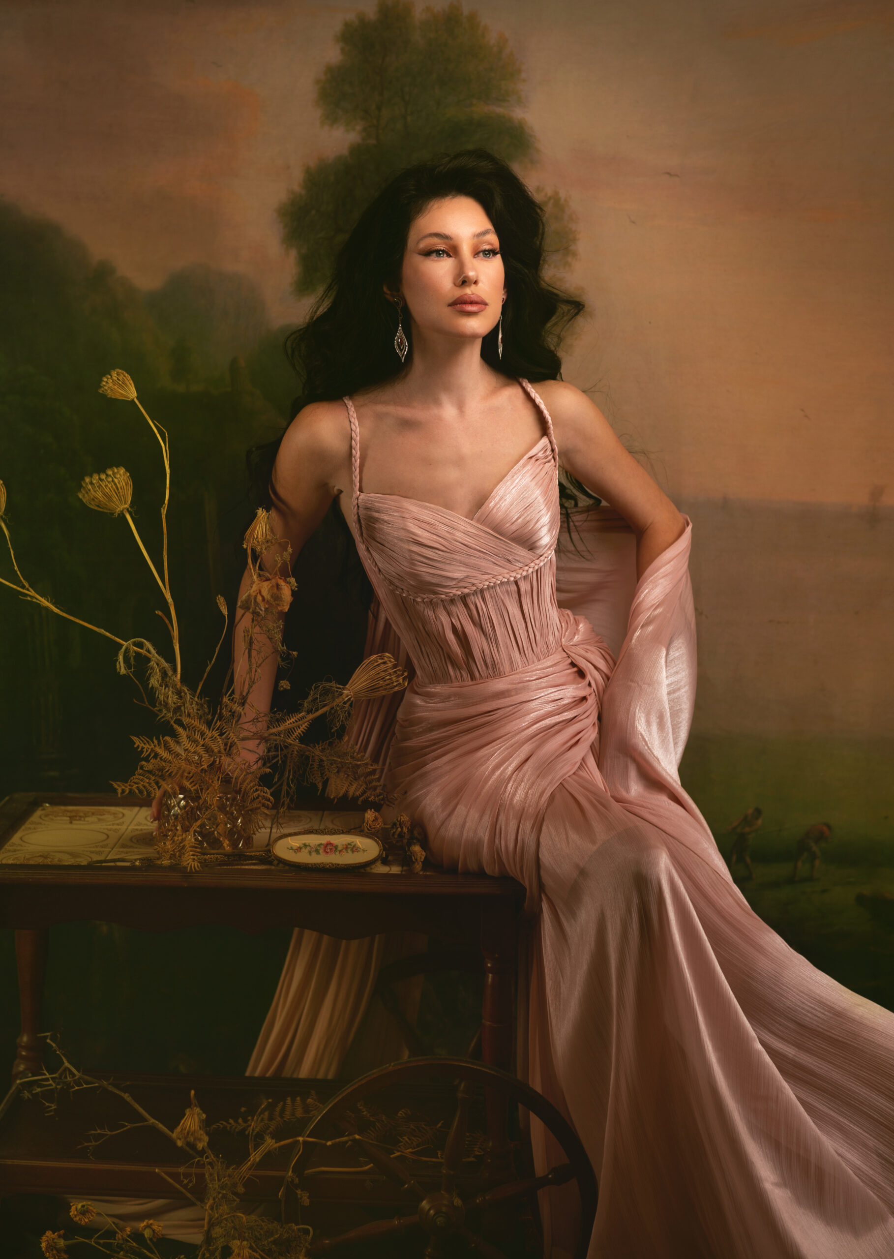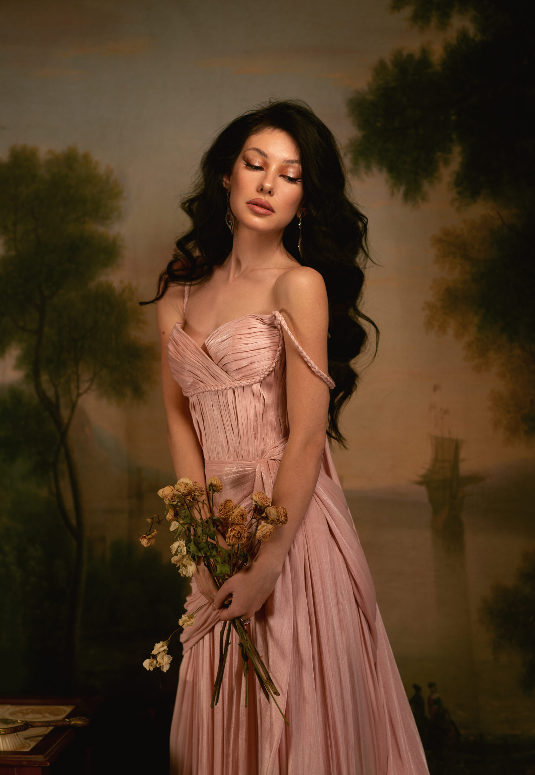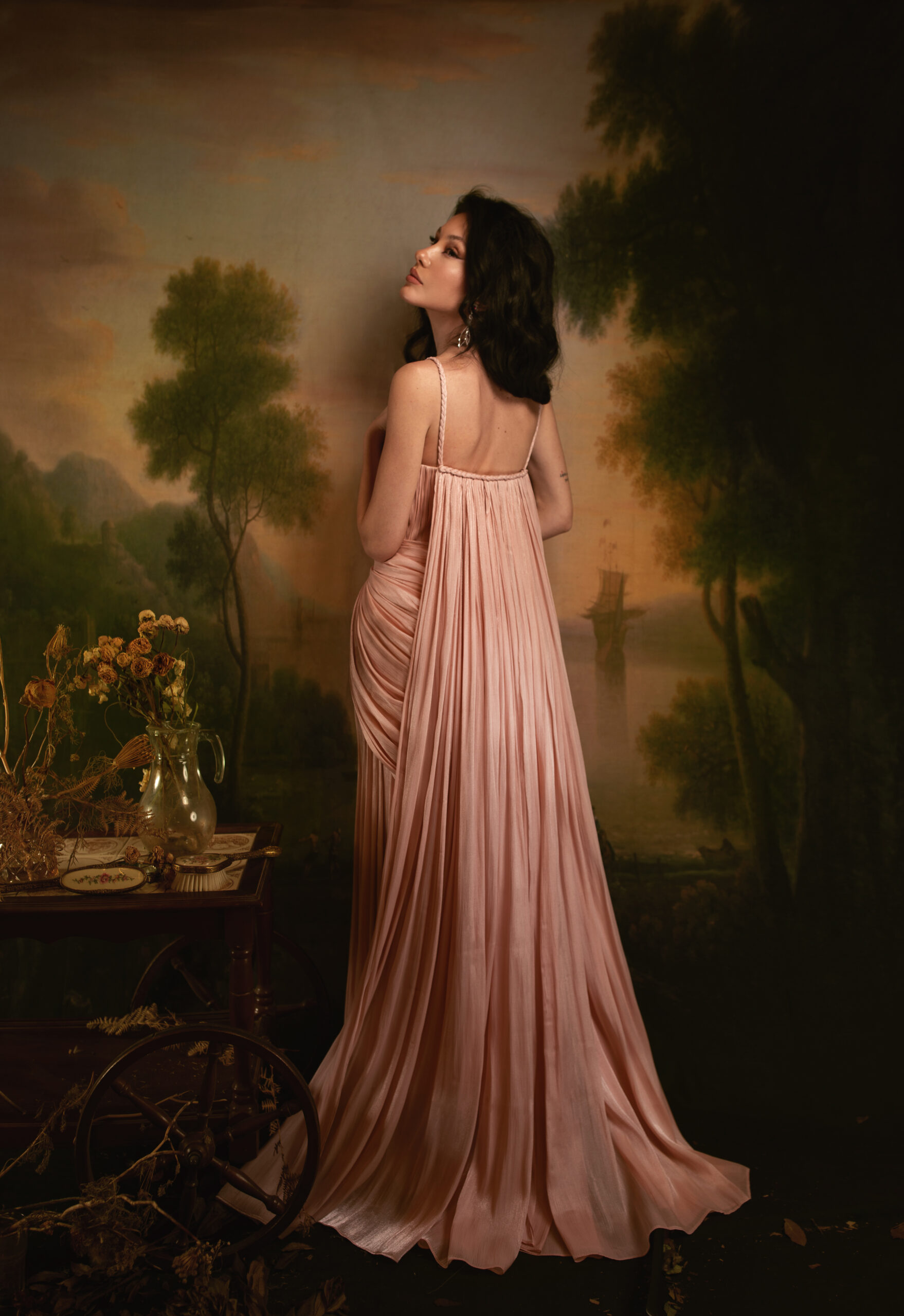 A softly corseted gown crafted in luminous plissé fabric, hand-ruched over the bodice and skirt for fluid movement. Designed in a romantic Rose Dawn hue, featuring braided straps and belt detailing, and a detachable draped cape that falls like a protective veil. A quiet statement of strength and femininity, guided by the spirit of ORA.