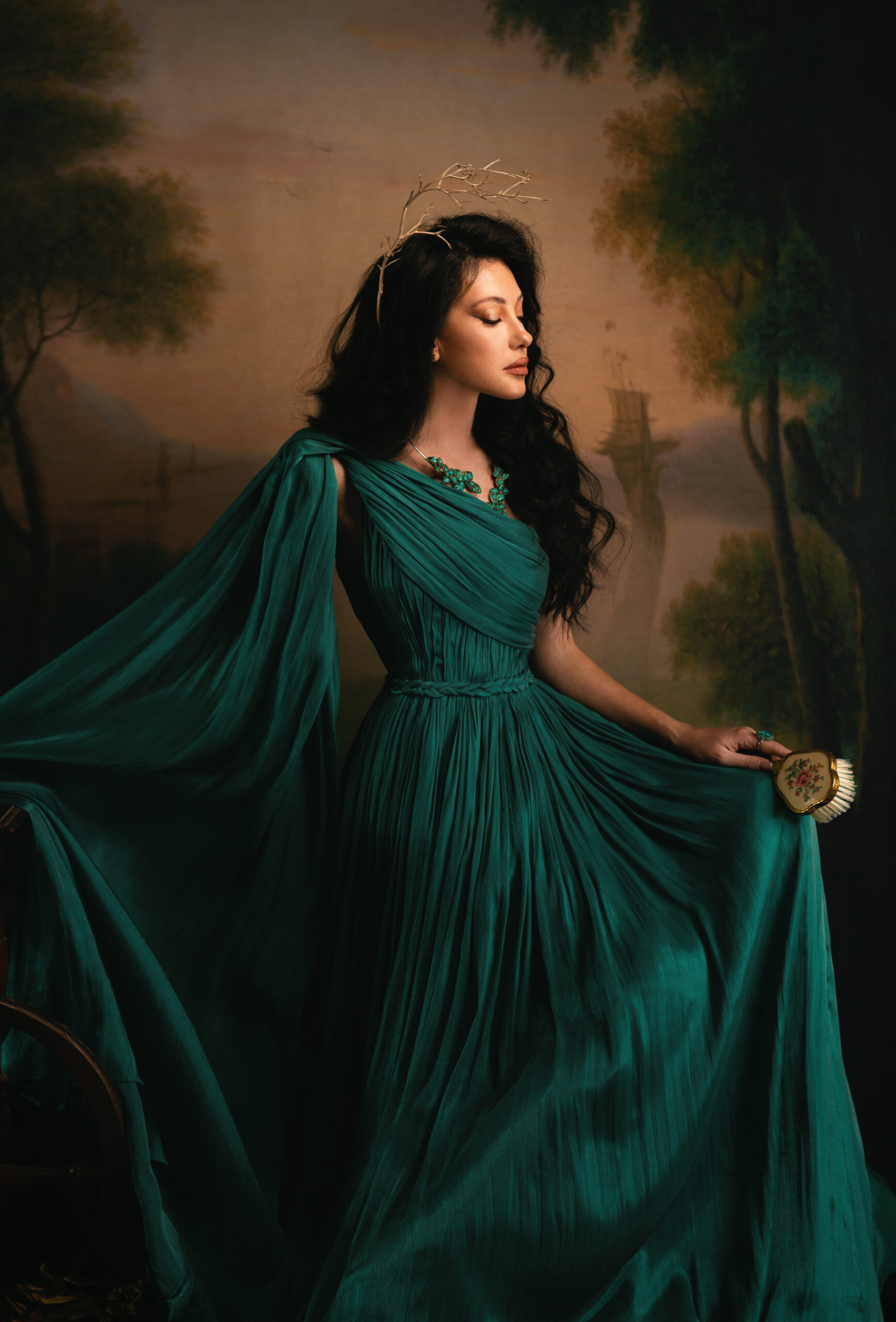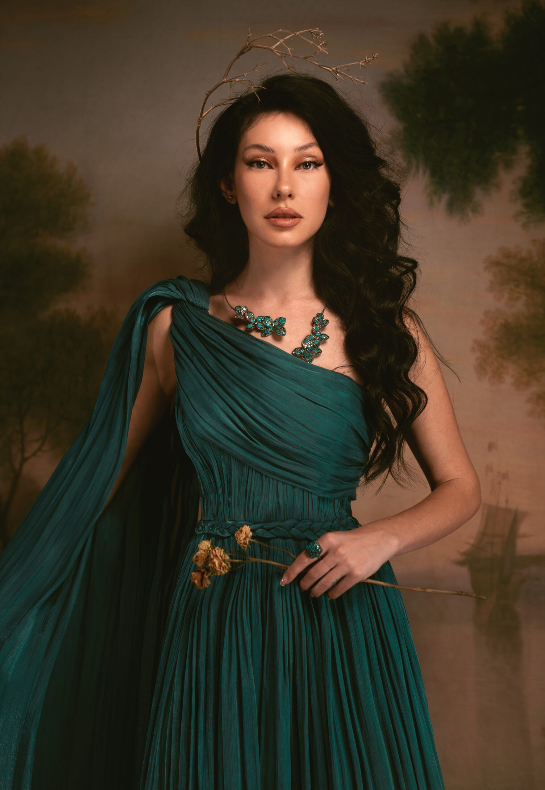 A flowing plissé gown in a deep verdant green, inspired by nature’s quiet guardianship. Designed with an asymmetrical one-shoulder drape, an integrated cape-style sleeve, and a delicately braided belt at the waist. The softly pleated skirt moves with effortless grace, creating a silhouette that feels grounded, ceremonial, and guided by the spirit of ORA.